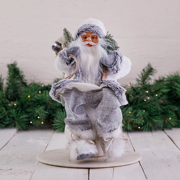 - A change from the traditional red and white clad Santa, this particular Santa figure is dressed in white and grey faux fur trimmed clothes and snuggly boots that are sure to keep him warm