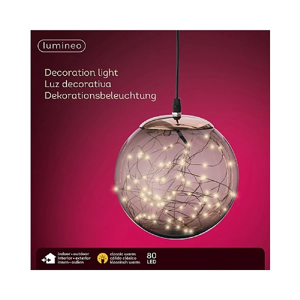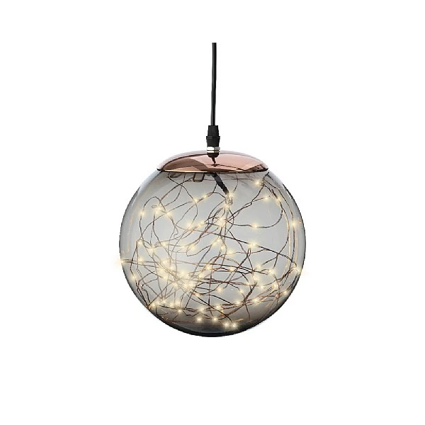 - Warm white LED micro lights in a smoky glass hanging globe