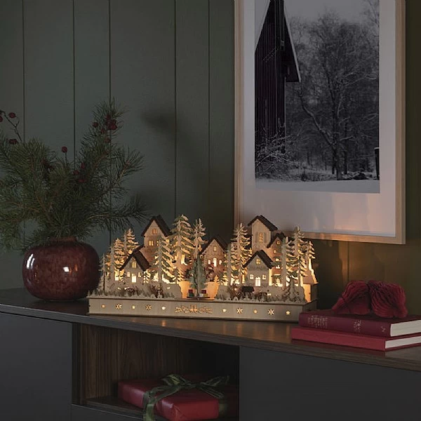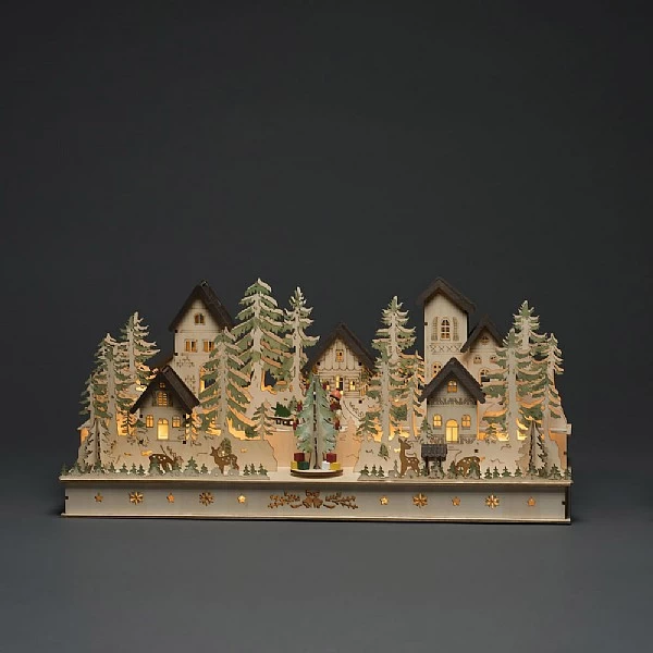 - Konstsmide Wooden Silhouette House & Figures with 17 LEDs is made from wood with intricate detail to represent a stunning alpine scene with houses, trees and deer
