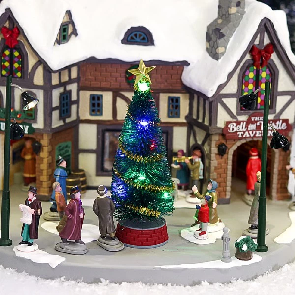 - Made from realistic polyresin with intricate detail, this is a charming Lemax olde worlde pub offering a festive welcome with its splendid wreaths and Christmas trees, including one enormous one complete with working lights in the centre of the piece
