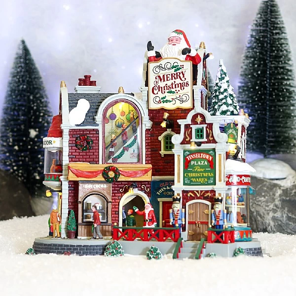 - As music plays and lights shine, a big Santa sits on the roof, wishing everyone a Merry Christmas!