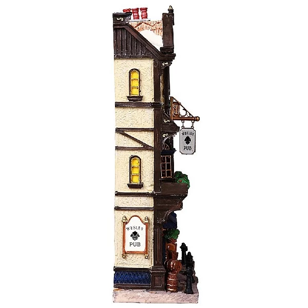 What you need to know:1 x Lemax Wesley PubPorcelain lighted buildingDimensons: Height 27cm, Width 21.5cm, Depth 7.6cmBattery operatedBatteries not included. Requires 3 x AAA/C adaptable, by using Lemax Power Adaptor #64517 or #74706 Lighted with fibre opticsLemax code: 45099