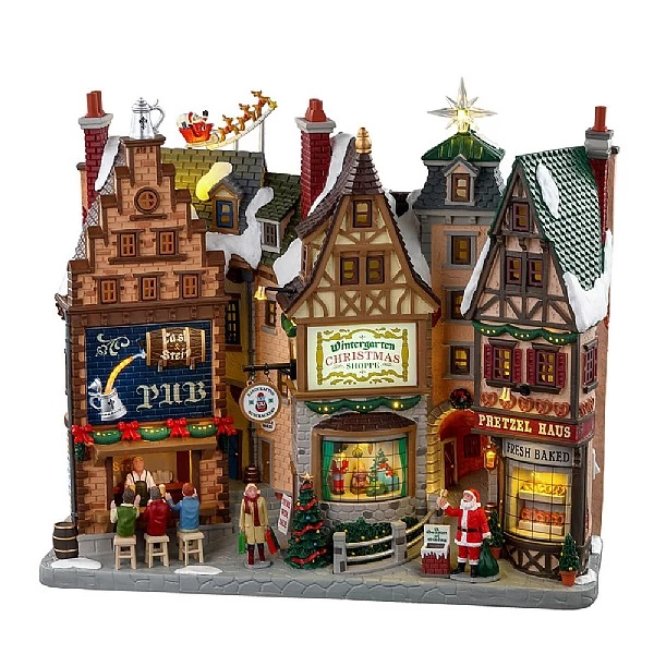 - On the roof, Santa is flying away on his reindeer-pulled sleigh