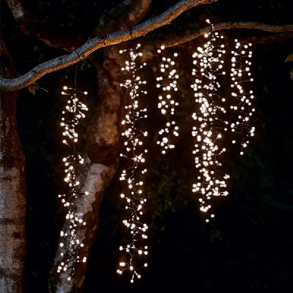 - This set of Lumineo lights features 6 lit drops of clusters of warm white LEDs which look simply magical cascading down from an outdoor tree