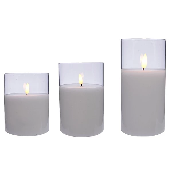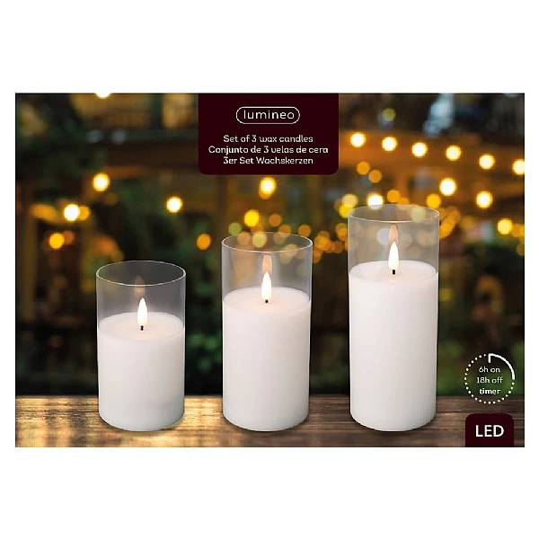 - This Lumineo Set of 3 Small LED Clear Glass Wax Candles use flickering LED to create the illusion of a real flame and are made using real wax too