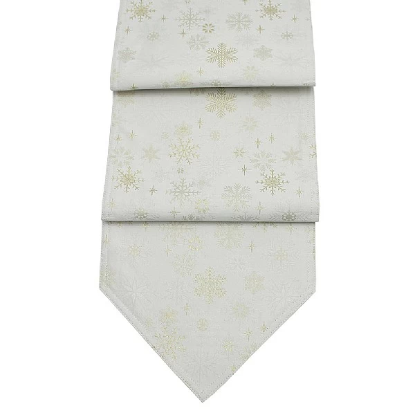 - Featuring beautifully embroidered gold snowflakes in a range of shapes and designs on a champagne background, this Christmas Table Runner from Peggy Wilkins adds sparkle, especially for candlelit dining