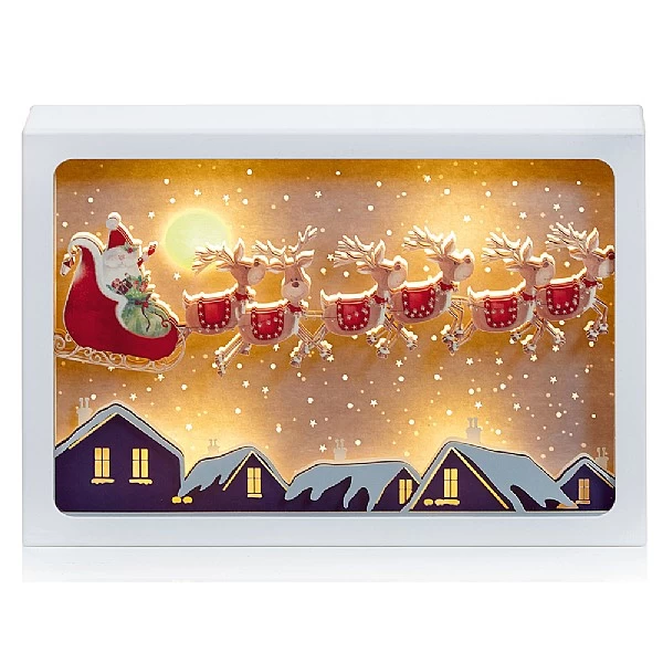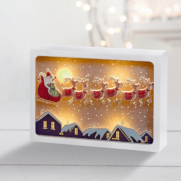- This beautiful diorama scene features a cute Santa and his reindeer flying across the snowy rooftops in a glowing sky