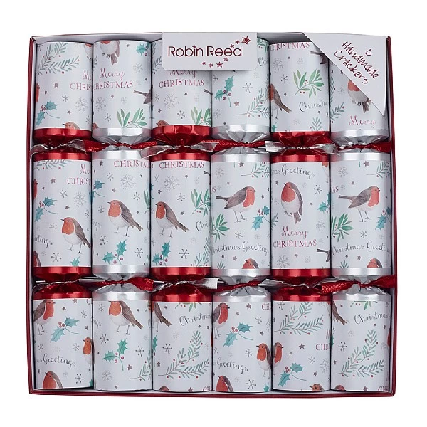 Why We Love It:Set of 6 handmade Christmas crackers with a classic robin design and finished with red and silver bowsSuits both contemporary and traditional themed table décorContains hats, jokes, and premium giftsIdeal for the whole familySince 1975 Robin Reed has been hand crafting the finest English crackers with materials sourced from all over the world to give their Christmas crackers a unique style and quality