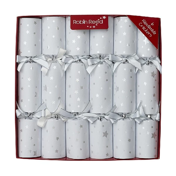 Why We Love It:Set of 6 handmade Christmas crackers designed in white with a silver star print and silver bows and bellsSuits both contemporary and traditional themed table décorContains hats, jokes, and premium giftsIdeal for the whole familySince 1975 Robin Reed has been hand crafting the finest English crackers with materials sourced from all over the world to give their Christmas crackers a unique style and quality