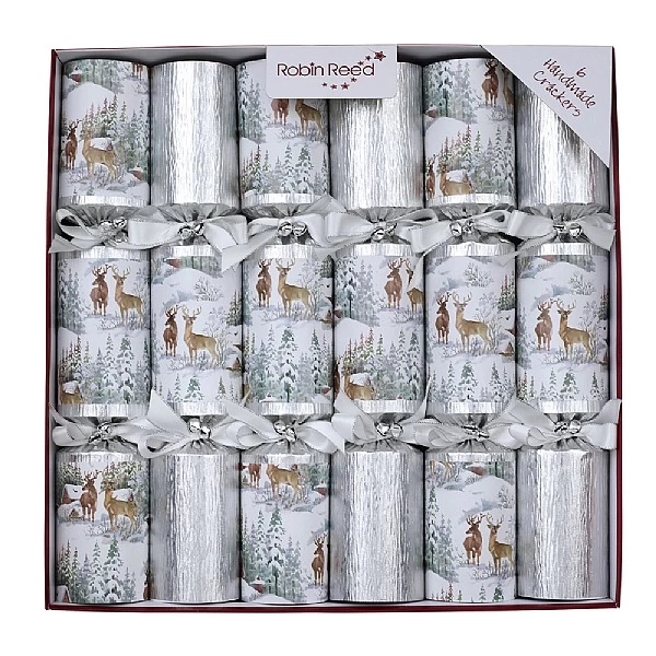 Why We Love It:Set of 6 handmade Christmas crackers with stunning silver foil wrapping and a beautiful deer in a frosty forest printSuits both contemporary and traditional themed table décorContains hats, jokes, and premium giftsIdeal for the whole familySince 1975 Robin Reed has been hand crafting the finest English crackers with materials sourced from all over the world to give their Christmas crackers a unique style and quality