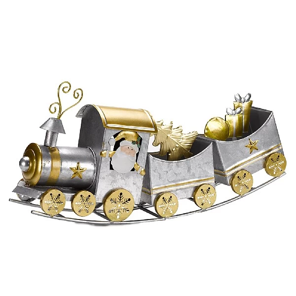 Why We Love It:This unique and beautiful metallic train ornament, Santa’s Sky Express, sits on a fun rocker style baseEven Santa is wearing gold as he drives this shimmering silver and gold trainMetallic hand-painted finishSuitable for indoor and outdoor use