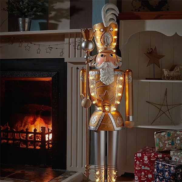 Why We Love It:Light up your festive season with this impressive 119cm tall metal Christmas Nutcracker ornament decorated in gold, silver and whiteA traditional Christmas ornament with contemporary illuminationFeatures 23 warm white, battery-operated, LEDs for a magical glowBeautiful glossy hand-painted finishIncludes 6 hrs on/18 hrs off timer