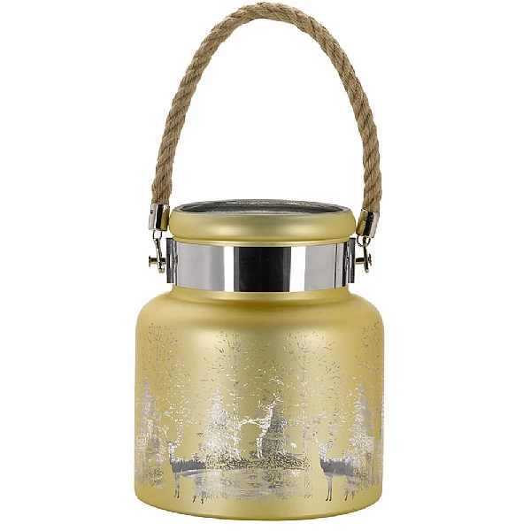 Why We Love It:An enchanting glass lantern in a festive gold tone, with a Winter Wonderland design that lights up to stunning effectPerfect for a gift, or Secret Santa presentJust drop in a string of mini lights, LED candle or even a wax candleA rustic rope handle is included for easy portability